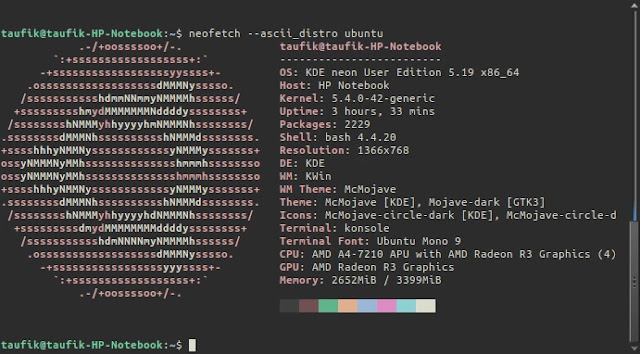Selain logo itu sendiri, terdapat beberapa informasi sistem yang sedang anda gunakan mulai dari Operating System, Kernel, Lamanya Komputer Hidup, Resolusi hingga skema warna pun ada.