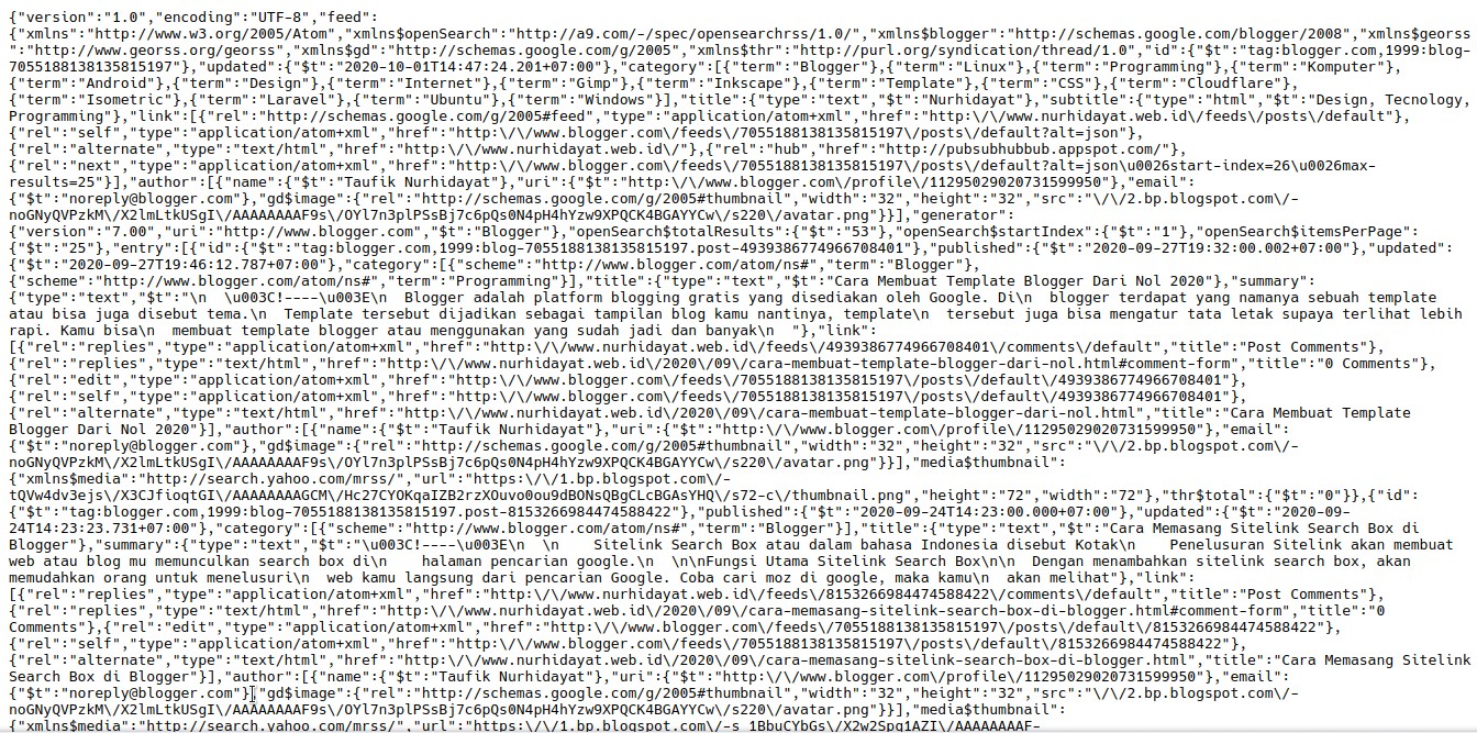 Blogger API V3 is better structured, not messy like URL feeds converted to JSON. Here's an example: